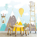 PAPIER PEINT ENFANT IDEAL POUR CHAMBRE GARCON SUR LE THEME MONTAGNE ET MONTGOLFIERE EN TROIS COULEURS. UNE INVIATION AU DEPAYSEMENT ET AUX SPORTS D'HIVER.