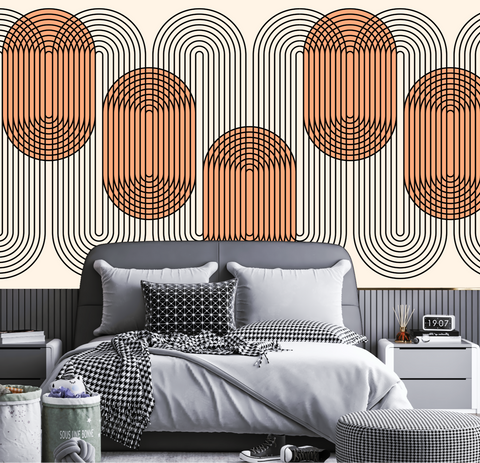 Élevez votre intérieur avec un papier peint art déco graphique qui assume ses courbes architecturées et son contraste noir, terracotta et ivoire pour un impact visuel chic et intemporel.