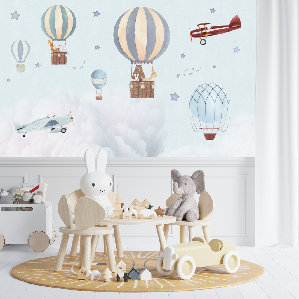 Un ciel aquarelle ultra tendre, des nuages cotonneux, des montgolfières pastel et de jolis avions rétro composent un décor apaisant qui invite aux rêves, aux histoires du soir et aux premiers voyages imaginaires. Les teintes poudre bleutées et sable réchauffent l’espace sans l’alourdir et créent une ambiance rassurante, parfaite pour une chambre de bébé comme pour une chambre d’enfant qui grandit.