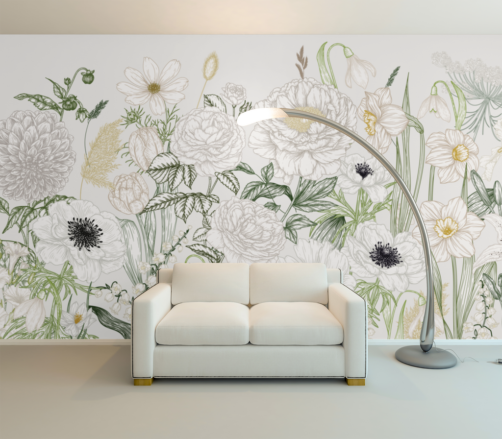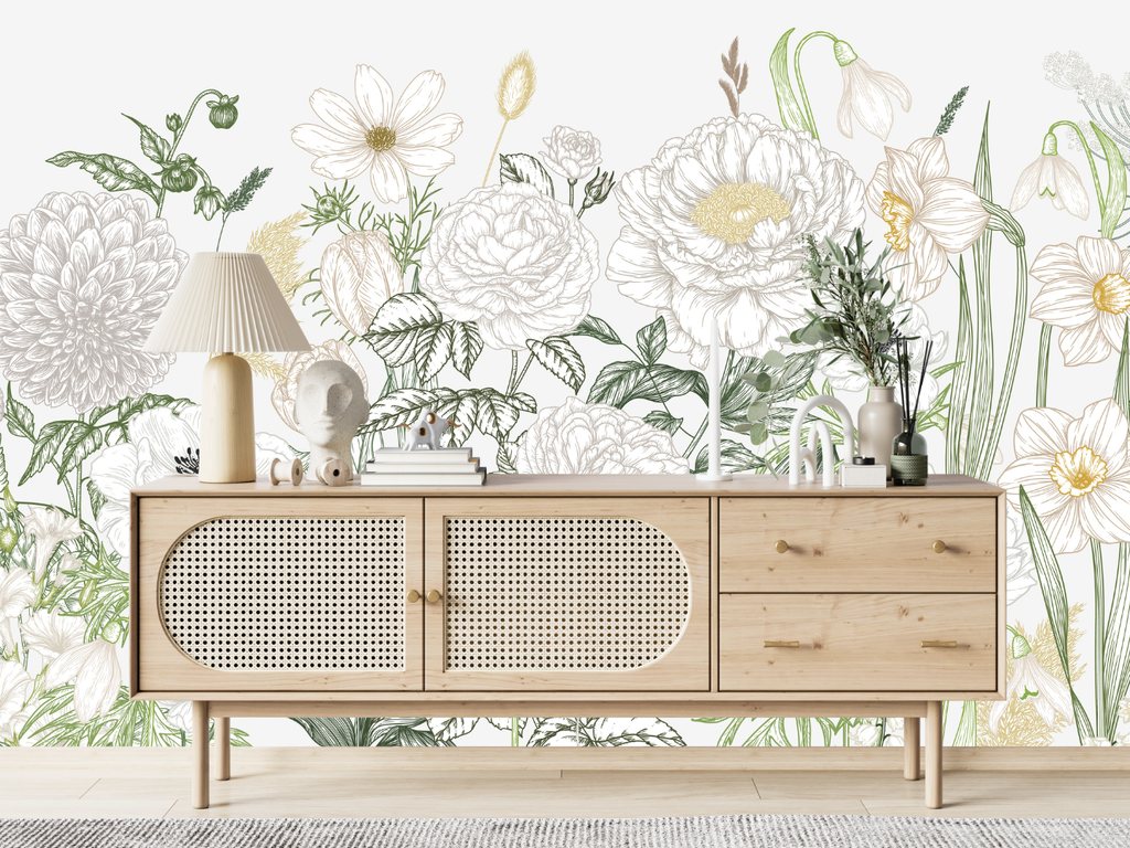 Les nuances douces de blanc, de vert et de beige s’harmonisent à merveille pour créer une atmosphère apaisante et lumineuse, idéale pour une chambre adulte élégante et naturelle. Chaque pétale, chaque tige est dessinée avec une finesse remarquable, rappelant les gravures botaniques anciennes tout en conservant une allure résolument contemporaine.
