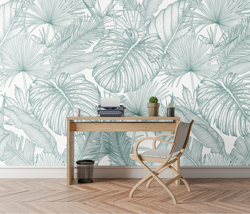 Les tons vert d’eau délicats sur fond clair confèrent à la pièce une légèreté visuelle et un sentiment de bien-être immédiat. Ce papier peint jungle adulte s’accorde idéalement avec une décoration contemporaine, scandinave ou bohème chic, associée à des matières naturelles comme le bois clair, le rotin ou le lin. Il apporte un charme sobre et intemporel, loin des clichés trop colorés, pour une touche d’exotisme élégante et reposante.
