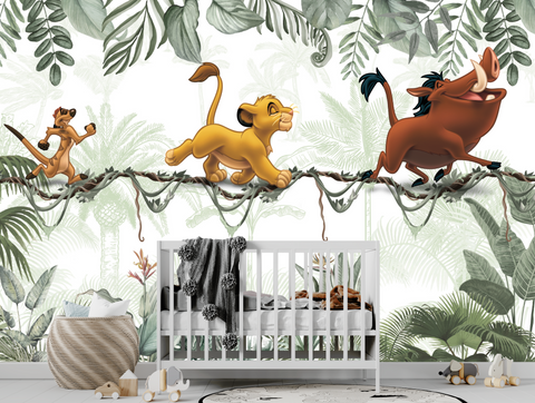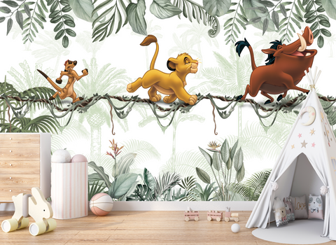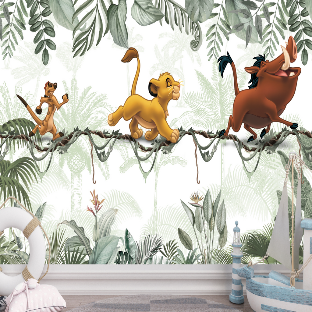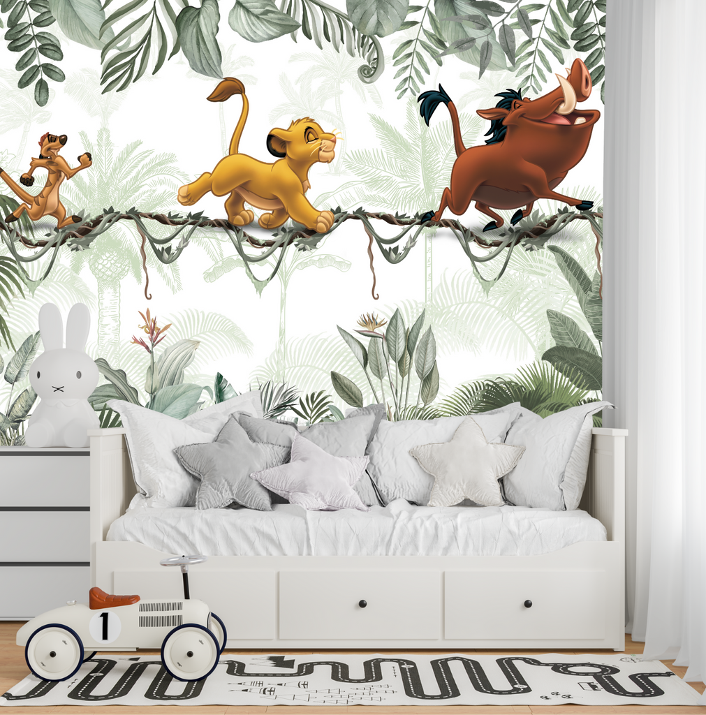Offrez à votre enfant un décor magique avec notre papier peint Le Roi Lion de la collection Papier Peint Animaux : Simba s’élance sur la liane, Timon et Pumbaa ouvrent la marche, le tout dans une jungle aux feuillages doux vert sauge et gris perle pour une ambiance rassurante et joyeuse.