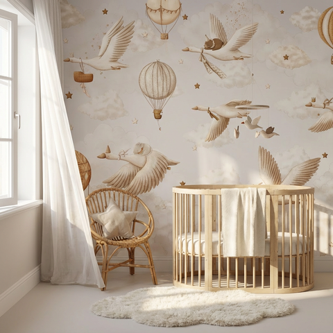 Pensé pour les parents en quête d’une atmosphère apaisante, ce décor transforme immédiatement une chambre de bébé ou d’enfant en un espace chaleureux, rassurant et empreint de rêve. Les teintes naturelles, douces et lumineuses s’accordent parfaitement avec un style de décoration scandinave, bohème, vintage ou encore une ambiance nuageuse très appréciée pour les chambres de nourrissons. Les détails soigneusement illustrés offrent une véritable scène poétique qui stimule l’imaginaire tout en apportant sérénité et élégance au quotidien.