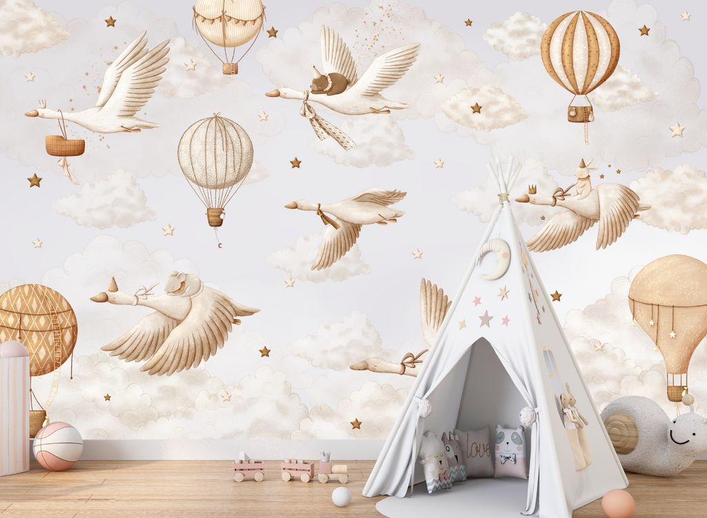 Ce papier peint oie enfant de notre collection Papier Peint Oiseaux invite votre enfant dans un univers tendre et aérien où de magnifiques oies majestueuses traversent un ciel rempli de nuages moelleux, d’étoiles dorées et de montgolfières délicates.
