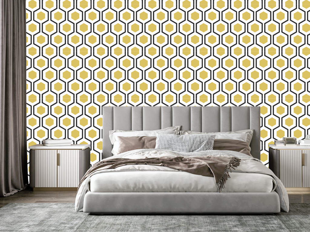 Côté décoration, ce motif hexagonal s’associe merveilleusement aux univers modernes et minimalistes, mid-century et art déco revisité : tête de lit capitonnée, bois clair ou noyer, laiton brossé, linge de lit en lin écru, rideaux taupe ou gris perle et touches moutarde ou charcoal en coussins et plaids. Sur les murs adjacents, nous recommandons un blanc cassé chaleureux ou un gris clair pour laisser le panoramique respirer, tandis qu’un parquet bois naturel et quelques luminaires aux lignes fines subliment la structure graphique du décor. Avec ce papier peint tendance géométrique, vous créez un intérieur à la fois moderne, élégant et lumineux, pensé pour durer et facile à accorder au fil des saisons.