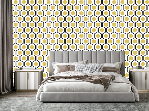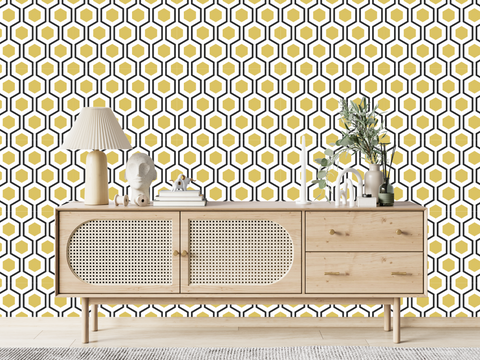 Son motif hexagonal façon alvéoles joue le contraste jaune miel, noir et blanc pour créer un rythme visuel chic sans alourdir l’espace. Nous fabriquons votre décor sur mesure afin de conserver des lignes nettes et une répétition parfaite, nous ajustons l’échelle des motifs à la hauteur sous plafond et nous pouvons personnaliser les couleurs, la position du raccord ou ajouter un détail discret pour signer l’ensemble. L’impression haute définition révèle la précision des contours et garantit un rendu lumineux, durable et facile d’entretien, idéal pour celles et ceux qui recherchent un papier peint tendance à la fois décoratif et intemporel.