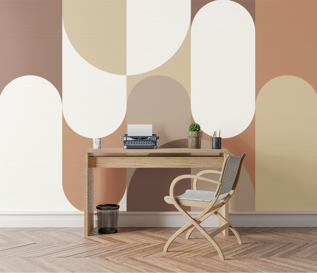 Habillez votre séjour avec un papier peint tendance pour salon qui allie chaleur et modernité : ce panoramique abstrait joue des formes arrondies, lignes graphiques et textures minérales dans une palette terracotta, sable, argile et graphite.