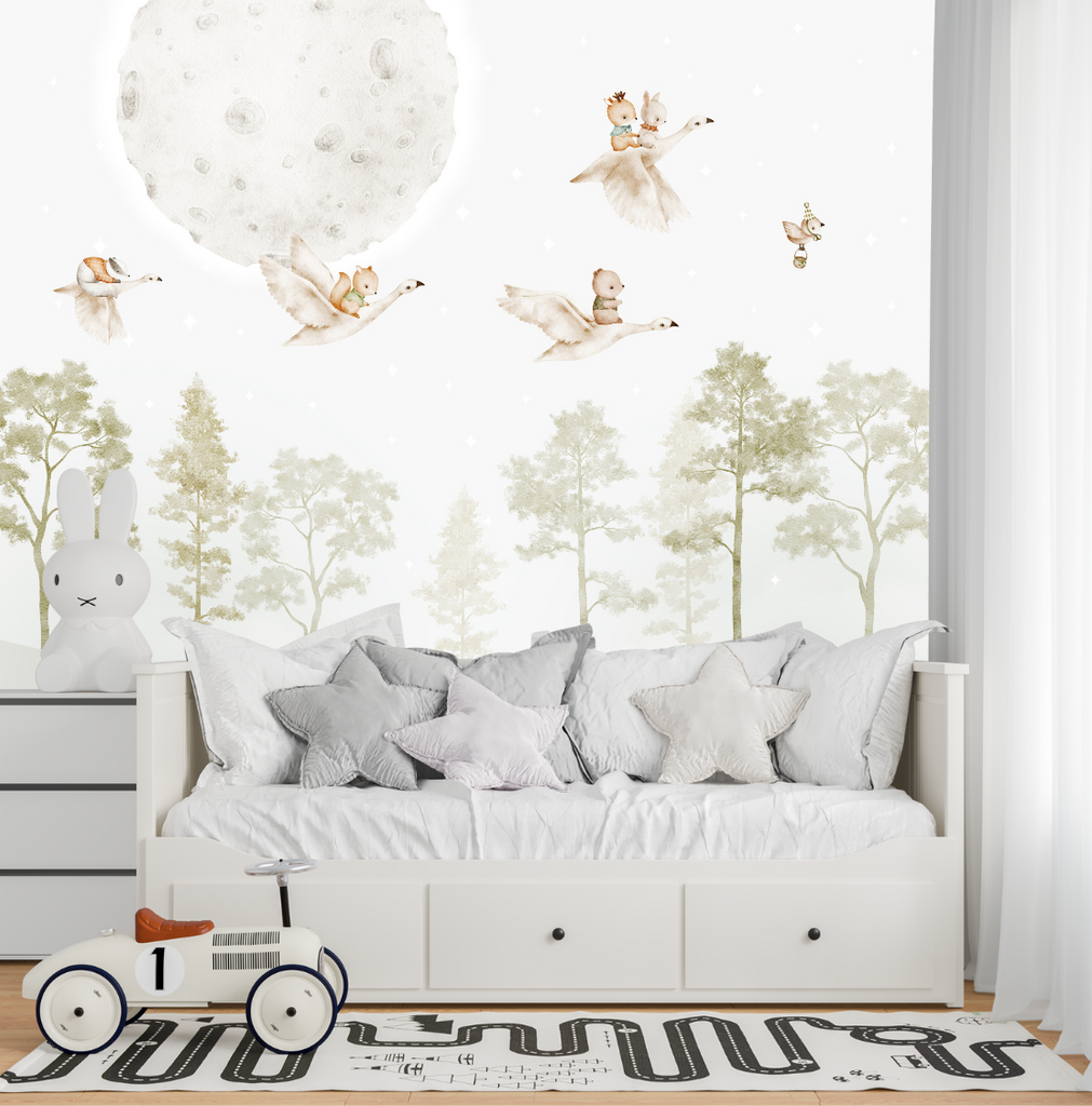 Le décor met en scène de tendres animaux voyageant sur le dos de majestueuses oies, évoluant dans un ciel lumineux dominé par une grande lune aquarelle et surplombant une forêt brumeuse. Cette composition délicate crée une atmosphère apaisante, parfaite pour favoriser l’imagination, le repos et la sérénité de votre bébé. Les teintes naturelles, mêlant beige, vert doux et touches lumineuses, s’intègrent harmonieusement dans une décoration scandinave, forestière, bohème ou dans une chambre au thème nature et animaux.